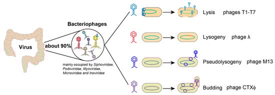 Characteristics of intestinal virus. Bacteriophage is the most abundant component of human intestinal virome (accounting for about 90%). For lytic growth, phages infect bacteria and synthesize their own components, then release new virions by lysing host bacteria. During lysogenic growth, phages inject their genomes into the bacteria and integrate them into the bacterial chromosome. When the phages enter the bacteria body but remain in a static state it is called pseudolysogeny. Finally, some phages infect bacteria and then bud to produce new phages.
