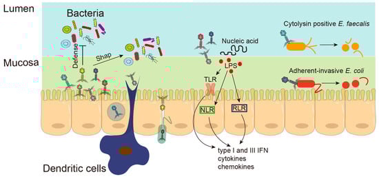 Bacterial components and phage DNA, released from the lysed bacteria, are the main ligands that trigger intestinal immunity through pattern recognition receptors (PRRs) in epithelial cells or immune cells (Figure 2). In addition, bacteriophages can directly motivate inflammatory responses in epithelial cells and immune cells in the intestine [56]. Phages have immunomodulatory activity, affecting the function of major populations of immune cells involved in innate and adaptive immune responses including phagocytosis and respiratory burst of phagocytes, cytokine production and production of antibodies against non-phage antigens [57]. Increased phage load causes expansion of immune cells in the gut and stimulates IFN-γ secretion through the nucleotide-sensing receptor TLR9, then exacerbates the colon inflammatory response [58]. Phage-caused intestinal inflammation exacerbates the hyperpermeability of the gut.