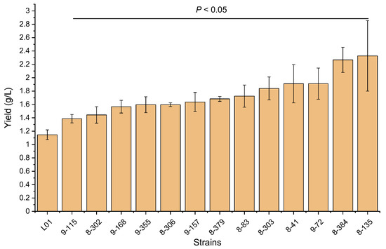 After conducting ARTP mutagenesis, we isolated the mutants and screened them primarily using blood agar plates. Out of 854 colonies, we obtained 76 mutants with significantly higher hemolytic activities. We then investigated the rhamnolipids production capacity of each mutant by measuring the yield of crude biosurfactants. After culturing the wild-type strain with 2% glucose as the sole carbon source for 60 h, the wild-type strain produced a crude biosurfactant yield of 1.15 ± 0.05 g/L (Figure 2). Thirteen of the mutant strains had significantly higher yields than the wild-type strain. The mutant strain 8-135 had the highest crude biosurfactants yield at 2.33 ± 0.53 g/L.