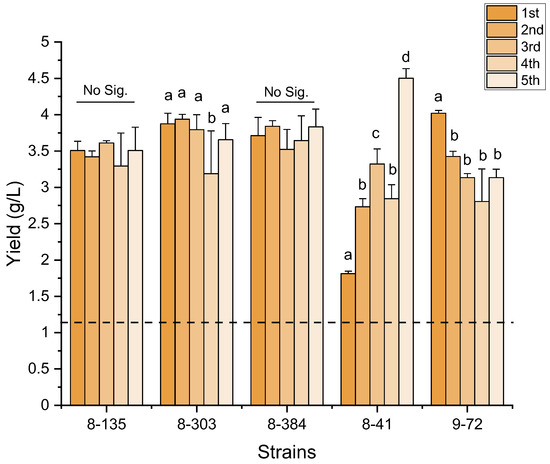 The crude biosurfactants yields of five high-yield mutants (8-41, 8-135, 8-303, 8-384, and 9-72) during five passages. The dotted line indicated the average yield of the wild-type strain. The presence of different lowercase letters indicates statistical significance (p < 0.01, Student’s t-test) between passages within each mutant.