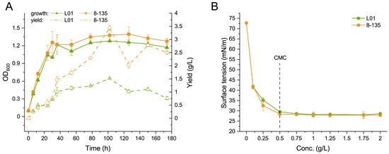 Functional verification of the representative mutant 8-135. (A) Growth and biosurfactant synthesis by the wild-type strain L01 and the mutant strain 8-135. (B) Surface activities of the crude biosurfactants produced by the wild-type strain L01 and mutant strain 8-135.