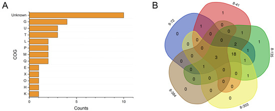 Comparative analysis of non-synonymous mutations in the high-yield mutants. (A) COG analysis of the genes with non-synonymous mutations in all sequenced mutants. G, carbohydrate transport and metabolism; U, intracellular trafficking, secretion, and vesicular transport; T, signal transduction mechanisms; L, replication, recombination, and repair; P, inorganic ion transport and metabolism; M, cell wall/membrane/envelope biogenesis; Q, secondary metabolites biosynthesis, transport, and catabolism; E, amino acid transport and metabolism; X, mobilome: prophages, transposons; O, posttranslational modification, protein turnover, chaperones; H, coenzyme transport and metabolism; K, transcription. (B) The distribution of the genes with non-synonymous mutations among the five sequenced mutants.