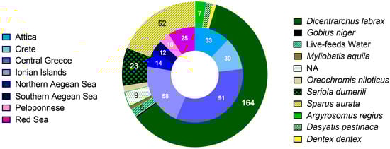 In Greece, which is among the main producers of gilthead seabream (Sparus aurata) and European seabass (Dicentrarchus labrax), vibriosis has been regarded as the most serious disease of these species [13,14]. This is also the case for other fish species cultured in the Mediterranean Sea [15]. Even though there have been occasional reports in the scientific literature of vibriosis in Greek aquaculture, the only systematic attempt to provide data on this issue was for the period 1998–2013, with a focus on European seabass [13]. Here, we have investigated incidents of vibriosis in several locations in Greece, including several commercial fish farms, providing data on their phenotypic and genetic profile. For comparative purposes, we included isolates from two hosts commonly found in aquaculture sites in the Red Sea, the gilthead seabream and the Nile tilapia. The former is a frequent host in our study. Additionally, we obtained Vibrio isolates from various hosts, including wild fish hosted in Cretaquarium, a public aquarium of HCMR in Crete that houses common aquaculture species with others found in the region. The aim of the study was to investigate the diversity of the vibrios, which are routinely isolated during vibriosis in Greece, with a special focus on Vibrio harveyi, and to discuss their role as opportunistic pathogens.
