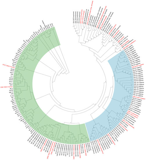 - Pascual, J.; Macián, M.C.; Arahal, D.R.; Garay, E.; Pujalte, M.J. Multilocus Sequence Analysis of the Central Clade of the Genus Vibrio by Using the 16S RRNA, RecA, PyrH, RpoD, GyrB, RctB and ToxR Genes. Int. J. Syst. Evol. Microbiol. 2010, 60, 154–165. [Google Scholar] [CrossRef]