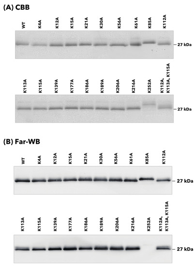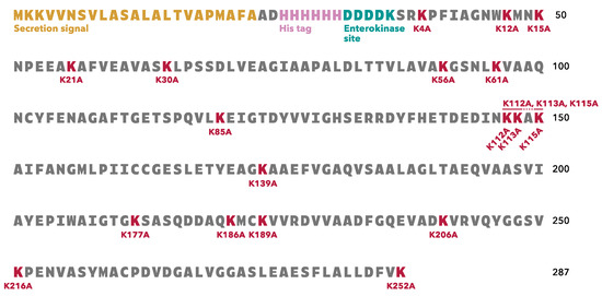 The binding properties of 20 rTpiA proteins, including the wild-type rTpiA, to human plasminogen were qualitatively analyzed. Each rTpiA was subjected to SDS-PAGE analysis and stained with CBB to confirm that each band was approximately 27 kDa (Figure 2A). In the K85A and K252A mutants of rTpiA, the bands were slightly shifted upward. The cause of this is not clear, but several instances have been reported in which a single amino acid substitution can result in fluctuations in the swim position in SDS-PAGE [19,20,21]. At least we have confirmed that the DNA sequence is correct in all rTpiA. Plasminogen was applied to each rTpiA protein, and the bound plasminogen was detected by far-Western blotting; no clear band was observed in the substituted rTpiA K252A (Figure 2B).