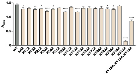 The binding properties of each site-specific substituted rTpiA to plasminogen were quantitatively measured in two ways. Plasminogen was added to microtiter plates coated with each rTpiA protein, and the amount of bound plasminogen was indirectly quantified using ELISA (Figure 3). Most of the substituted rTpiA showed significantly reduced binding to plasminogen compared to that of the wild-type rTpiA. Among them, the substituted rTpiA K252A showed significantly lower binding to plasminogen than the other substituted rTpiA proteins (p < 0.0001).