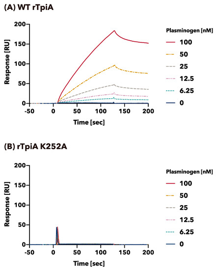 The binding profiles of plasminogen to wild-type rTpiA and substituted rTpiA K252A were quantitatively analyzed by SPR (Figure 4). Human plasminogen is bound to wild-type rTpiA mounted on the biosensor in a dose-dependent manner (Figure 4A). The apparent binding rate (ka), dissociation rate (kd), and dissociation constant (KD) of plasminogen and wild-type rTpiA were ka = 4.34 × 103 1/Ms, kd = 3.75 × 10−3 1/s, and KD = 8.65 × 10−7 M, respectively. In contrast, plasminogen showed little binding to the substituted rTpiA K252A at the same dose (Figure 4B), and therefore, ka, kd, and KD were not calculated (Figure 4B).