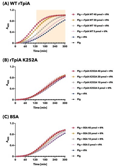 In our previous studies, we discovered that the addition of rTpiA enhanced the activation of plasminogen by the activator tPA [8]. In this study, we investigated the effect of site-specific substitution of rTpiA, which no longer allows binding to plasminogen, on plasminogen activation. Plasminogen was activated by tPA; we observed a time-dependent increase in absorbance as the chromogenic plasmin substrate was degraded (Figure 5). As reported previously, pre-incubation of plasminogen with wild-type rTpiA led to a significant dose-dependent increase in tPA-induced plasminogen activation (Figure 5A). However, when plasminogen was pre-incubated with substituted rTpiA K252A, plasminogen activation by tPA was not promoted (Figure 5B). We used BSA as a control, which did not promote plasminogen activation (Figure 5C). Based on our findings, we conclude that TpiA binds to plasminogen to facilitate plasminogen activation.