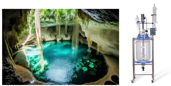 An AI-made illustration of a natural phenomenon—a Cenote, surface connection to subterranean water bodies, usually represented by small sheltered sites with no surface exposed water containing small numbers of bacteria, next to a stirred jacket glass bioreactor. The Cenote illustration was made by Deep Dream Generator, https://deepdreamgenerator.com (accessed on 25 March 2023).