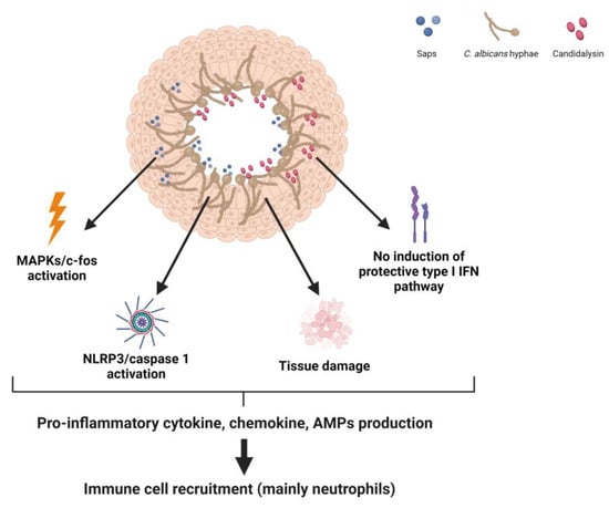 Subsequent to adhesion, Candida hyphae can penetrate epithelial cells through two distinct mechanisms: endocytosis and active penetration. The former is induced by the interaction of the C. albicans proteins Ssa1p and Als3p with cadherins and EGFR/Her2 [25,26,28,29], while the latter occurs when the growing hyphal tip pushes the epithelial cell membrane and leads to cell damage through the release of various virulence factors, including the cytolytic peptide toxin candidalysin, secretory aspartyl proteinases (SAPs), lipases and phospholipases. Recognition of the filamentous forms of Candida by VECs leads to sustained activation of all three mitogen-activated protein kinase (MAPK) pathways (p38, JNK and ERK1/2), which in turn, leads to c-fos activation via p38 and release of antimicrobial peptides, such as alarmins and pro-inflammatory cytokines (GM-CSF, G-CSF, IL-6, IL-1α, IL-1β, IL-36γ and CCL20) that are essential for the recruitment of innate immune cells, mainly neutrophils and macrophages [18,20,30,31,32,33,34]. Several recent investigations showed that fungal components, i.e., candidalysin [35,36,37] and SAPs, as well as the intracellular damage-responsive molecular complex, called the NLRP3 inflammasome, of VECs [38,39,40,41] are all critical actors in VVC immunopathology. Indeed, both candidalysin and SAPs have been found to trigger strong and persistent activation of the NLRP3-caspase-1 pathway to lead to the production of pro-inflammatory cytokines, particularly IL-1β (the major inflammasome effector), and recruitment of neutrophils, which (however) appear to be unable to eradicate the fungal infection and, actually, further contribute to the perpetuation of the chronic inflammatory status [20,42]. This is discussed in more detail in the next section.