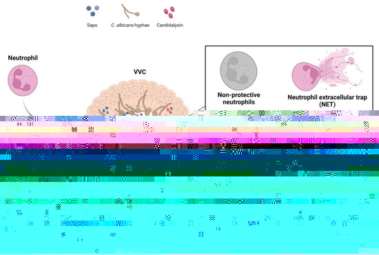 Overall, despite the massive infiltration of neutrophils into the vaginal lumen, they not only are unable to clear C. albicans cells, but also worsen the fungus-mediated damage and promote a hyper-inflammatory loop that confines the vaginal mucosa to a chronic inflammatory state [3,10,20,21,33,65,66,67,68]. However, despite extensive research efforts, the reasons for the impaired neutrophil effector activity remain a mystery and are currently the subject of considerable research on the pathogenesis of VVC, which is presently an enigmatic infection. Recent findings have shed light on the mechanisms underlying the neutrophil dysfunctionality, and one of the mechanisms is the presence of specific factors that can inhibit neutrophil effector functions in the vaginal environment during VVC. In particular, Yano et al. [42,69] demonstrated that the proteoglycan heparan sulphate, which is present at high levels in the estrogen-responsive state, is a competitive inhibitor of the interaction between neutrophils and Candida. In addition, Ardizzoni et al. [10,70] showed that perinuclear anti-neutrophil cytoplasmic antibodies, which are present at high levels in women with VVC, in comparison to healthy women, drastically reduce the ability of neutrophils to eliminate the fungus.