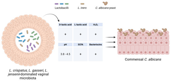 On account of their ability to adhere to the vaginal mucosa, lactobacilli form a biological barrier and compete with Candida for adhesion sites on epithelial receptors. An in vitro study, investigating the ability of L. crispatus to adhere to VK2/E6E7 VECs and counteract C. albicans growth, showed that L. crispatus significantly inhibited the adhesion ability of Candida [102]. Moreover, lactobacilli produce a wide range of antimicrobial substances, such as lactic acid, bacteriocins, hydrogen peroxide (H2O2), and a variety of metabolites [103]. The production of a large amount of d-lactic acid by lactobacilli maintains the vaginal pH at <4.5 and inhibits the growth of potential pathogens. Furthermore, a low pH level impairs the dimorphic transition from the avirulent yeast to the virulent hyphal morphotype in C. albicans and, thus, contributes to maintaining the fungus in a state of immune tolerance [104]. Lactic acid, in both protonated l- and d-isomers, has also been shown to affect host immunity through diverse mechanisms, including its ability to dampen an exaggerated immune response by increasing the production of anti-inflammatory mediators, i.e., IL-1RA, from vaginal epithelial cells, as well as by inhibiting the production of pro-inflammatory cytokines, such as IL-6, IL-8, tumor necrosis factor alpha (TNF-α), RANTES (regulated on activation, normal T cell expressed and secreted) and macrophage inflammatory protein-3 alpha (MIP3α), by immune cells [105,106,107].