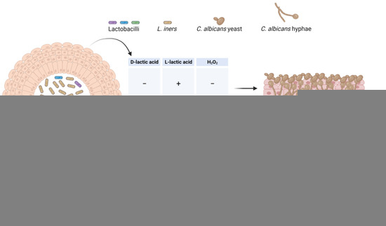 Disruption of the vaginal ecosystem may also contribute to the overgrowth of pathogens that are responsible for complicated vaginal infections, including VVC. In particular, a reduction in specific health-associated Lactobacillus spp., such as L. crispatus, coupled with an increase in L. iners, can predispose women to C. albicans infection. The mechanisms by which L. iners offers less protection against the fungus, leading to the onset of VVC, are not yet completely understood. To this end, further studies are required to better characterize the exact role of this intriguing species in vaginal health and diseases, such as vaginal candidiasis. Understanding of the complexity of the interaction between C. albicans and vaginal lactobacilli could offer potential avenues for improving women’s health through probiotic-based therapeutic approaches. However, it should be noted that although many in vivo and in vitro studies have demonstrated that Lactobacillus spp. have a beneficial effect on the prevention and/or treatment of VVC, clinical data are still scarce and need to be further implemented.