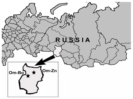Sites of specimen collection in Omsk province of Western Siberia. Stars shows the locations of sampling sites.