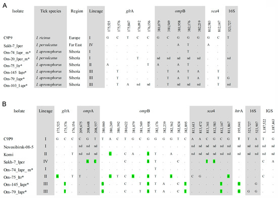 (A) Condensed alignment of gltA (840 bp), ompB (1255 bp), sca4 (783 bp), and 16S rRNA (684 bp) gene fragments of R. helvetica sequence variants from this study; (B) Condensed alignment of gltA (1037 bp), ompA (1417 bp), ompB (3100 bp), sca4 (2398 bp), htrA (499 bp), 16S rRNA (1070 bp) genes and 23S-5S IGS region (489 bp) of R. helvetica genetic lineages. Variable nucleotide positions are given according to sequence R. helvetica strain C9P9 (AICO01000000). * the specimens from this study. Non-synonymous polymorphic sites are highlighted in green.