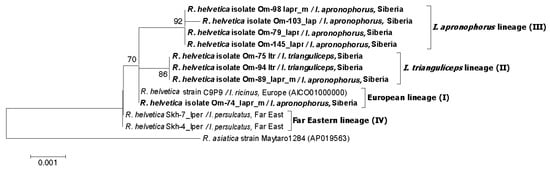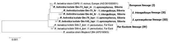 The long-length sequences of R. helvetica (above 11,500 bp) were determined for specimens belonging to various phylogenetic groups. Analysis of R. helvetica sequences from this study and available sequences from Europe (mainly from Germany) [47], North Western Russia [31], Western Siberia, and the Far East [15,27] demonstrated a high genetic variability of R. helvetica. The analyzed sequences can be reliably assigned to four genetic lineages. However, the association of different lineages with specific tick species and territories was not observed in all cases. Thus, although the European genetic lineage (lineage I) dominated I. ricinus in Europe, it was also found in I. persulcatus and I. apronophorus from Western Siberia. Similarly, I. trianguliceps genetic lineage (lineage II) was found in both I. persulcatus and I. trianguliceps ticks from two remote regions of Russia. On the contrary, I. apronophorus genetic lineage (lineage III) was identified only in I. apronophorus from Western Siberia; the Far Eastern genetic lineage (lineage IV) was identified only in I. persulcatus from the Far East.