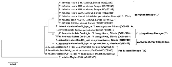 The phylogenetic tree constructed by the ML method based on nucleotide sequences of the 2684 bp fragment of the ompB gene of R. helvetica. The sequence of R. asiatica was used as outgroup. The scale bar indicates an evolutionary distance of 0.001 nucleotide per position in the sequence. Significant bootstrapping values (>70%) are shown on the nodes. The sequences of R. helvetica determined in this study are in boldface.