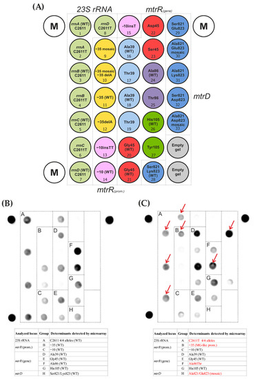 DNA hydrogel microarray for detecting mutations in the N. gonorrhoeae 23S rRNA genes mtrR (coding and promoter regions) and mtrD associated with resistance to azithromycin. (A). Configuration of the microarray. The microarray contained 33 elements with immobilized oligonucleotide probes, 2 elements without probes (empty gels), and 3 marker elements (M) for the proper image acquisition and processing of the fluorescent signals. The microarray elements are drawn as circles inside, where the analyzed mutations are indicated. The number inside each circle corresponds to the number of immobilized probes (the sequences of the probes are provided in Supplementary File S1). The groups of elements (8 groups) for the analysis of the mutations in the different loci are represented by different colors. (B,C). Fluorescence hybridization patterns of the microarrays after the analysis of genomic DNA obtained from different N. gonorrhoeae isolates. The groups of elements are designated by dashed lines. The elements with detected mutations are noted with red arrows. (B) A wild-type isolate (wt) carrying no mutations in the 23S rRNA, mtrR, or mtrD genes. (C) Isolate carrying the C2611T mutation in all four alleles of the 23S rRNA gene, the mosaic (Meningitidis-like) mtrR promoter, the Ala86Thr mutation in the mtrR gene, and the Ser821Ala and Lys823Glu mutations in the mosaic mtrD gene.