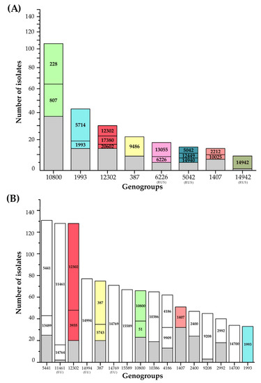 Comparison of the genogroups for the Russian (A) and European (B) N. gonorrhoeae populations. Genogroups with a (RUS) index include isolates of the Russian NG-MAST types not found in European countries; those with an (EU) index include isolates of the sequence types found only in Europe. The numbers inside the columns show the main NG-MAST types of the genogroup; NG-MAST types with the highest number of isolates are highlighted by colors, with gray indicating the remaining types. The colors representing the genogroups in Figure 2, Figure 3 and Figure 4 are the same.