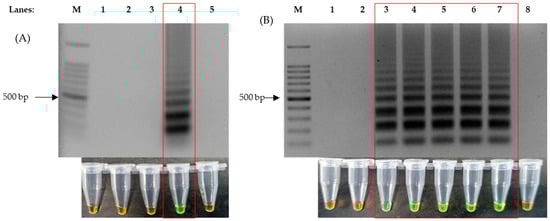Formation of ladder-like bands on agarose gel electrophoresis produced by LAMP reaction and colorimetric changes of SYBR Green from orange to green, as highlighted in the red box. (A) The correct ratio of inner, outer and loop primers for successful LAMP reaction (LAMP-UV, top and LAMP-SYBR Green, bottom), lane 1: 100 bp DNA ladder, lane 2: primer ratio of 1:1:1, lane 3: primer ratio of 2:1:2, lane 4: primer ratio of 4:1:4 and lane 5: primer ratio of 8:1:8. (B) Agarose gel electrophoresis results of 8 mM of added MgSO4 against time (LAMP-UV, top and LAMP-SYBR Green, bottom), lane M: 100 bp ladder, lane 1: 1 min, lane 2: 5 min, lane 3: 10 min, lane 4: 15 min, lane 5: 20 min, lane 6: 25 min, lane 7: 30 min and lane 8: non-template control at 30 min.