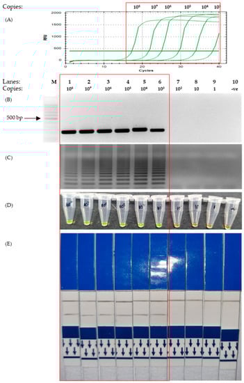 The sensitivity test showed that the detection limit of LAMP with regard to Envelope (E) gene primers was lower than that of the PCR. It can be observed that both qPCR and end-point PCR had a detection limit of 104 copies (Figure 4A,B). However, as depicted in Figure 4C–E, the corresponding photos showed that the detection limit of LAMP was 10-fold lower at 103 copies.