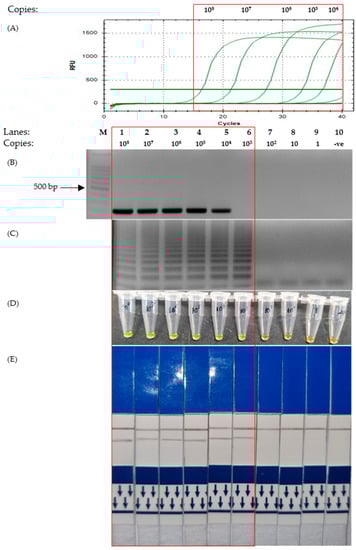The results for the sensitivity test of the M gene showed that the LAMP protocol was able to detect as little as 103 copies of plasmids, as visualized with both UV and colorimetry by SYBR Green staining and LFD (Figure 3C–E). This is similar to that of the PCR tests, which were able to detect 103 copies, as indicated by the graph and agarose gel photo in Figure 3A,B.