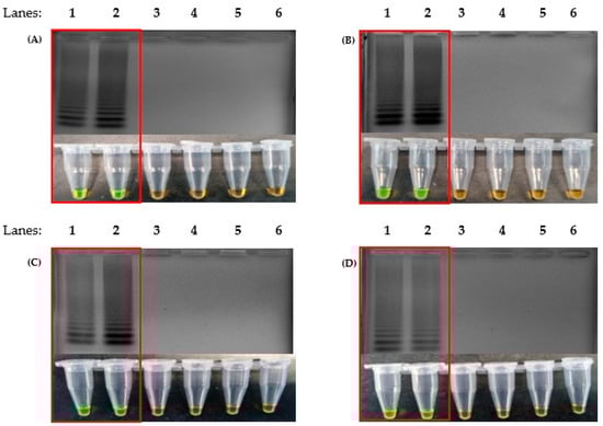 The colorimetry LAMP visualization method used in this study was the addition of SYBR Green. Color changes were observed to indicate positive (green) and negative (orange) results (Figure 1A Bottom). However, as seen in lane 6 (Figure 3D and Figure 4D, respectively), the color changes we not as vivid. SYBR Green is a DNA intercalating dye with double-stranded DNA and showed color changes from orange to green [47,48]. This method is rapid in the sense that positive detection was observed with the naked eye without the need for agarose gel electrophoresis. However, at a low copy number of templates, the intermediate colors varied from individual observers as observed by others [49,50]. Therefore, colorimetric visualization is not the best option for LAMP. Other colorimetry dyes were documented for LAMP visualizations with varying success rates. This included phenol red [51,52], leuco crystal violet [53], calcein [54], and hydroxy-naphthol blue [55].