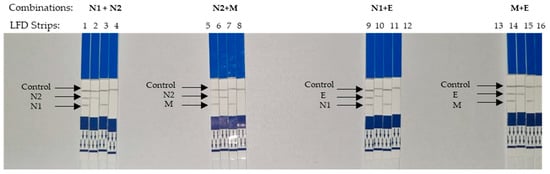 Four different combinations were made from the designed primers (Figure 6). This was because the differentiating labels were only digoxigenin (N1 and E) and fluorescein (N2 and M). Therefore, primers with the same labels could not be used in combination. As observed, in a multiplexed reaction, two test lines were observed on a single LFD.