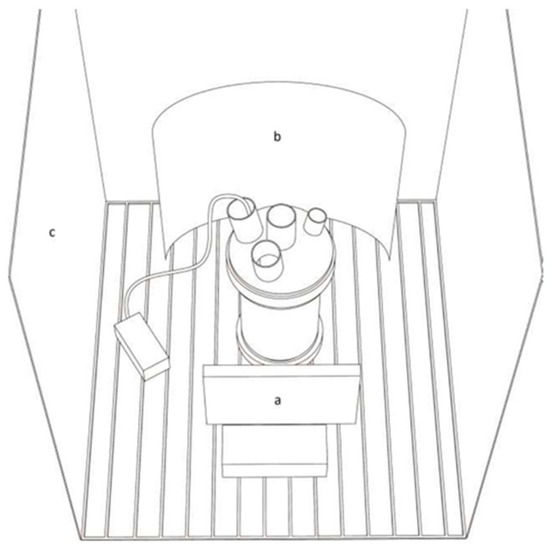 Schematic representation of a culture vessel in the climatized chamber. Light source (a), reflection surface (b), chamber white walls (c).