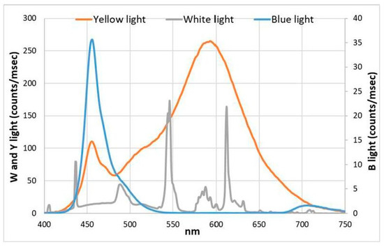 To evaluate the response of L. fusiformis to different light qualities, the culture was divided into two subcultures and, successively, one was exposed to blue light (λ max 460 nm) and one to yellow light (λ max 590 nm), with PAR still being 150 μE m/2 s/1 as in Silva et al. (2020) and Sforza et al. (2012) [10,11]. These last authors showed that such intensity corresponded to the highest efficiency of light absorption by algal cultures. The energy flux is different at different wavelengths, but the number of photons is the factor to be considered, since a single photon contributes to each elementary photochemical act [12,13].