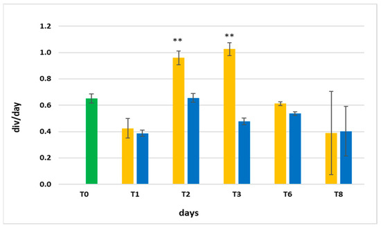 Daily growth rates obtained from the average in vivo absorption at 440, 620, and 680 nm starting from T0 (green bar) during the experiment with blue light (blue bar) and yellow light (yellow bar). ** Significant difference (p < 0.01) between yellow and blue data at T2 and T3.