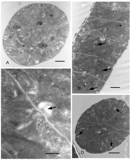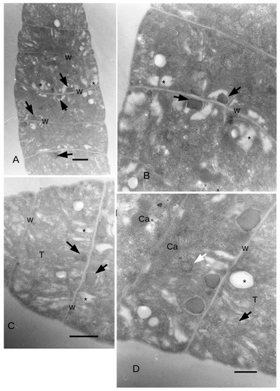 L. fusiformis filaments grown in yellow light (8 days). TEM images. (A): The filament width is 5.7 μm on average, while the cells’ height ranges from 2 μm in the middle of each cell to about 3 μm along the longitudinal tangential walls. Cyanophycin granules (arrowheads) are common in the cytoplasm. In many points close to the walls, some thylakoids are expanded (asterisks). Bar = 1 μm. (B): Cyanophycin granules (arrows) are common close to the transversal walls, adjoining thylakoids expansions. Bar = 1 μm. (C): In the final cells of the filaments, thylakoids membrane extends in the middle of the cell. Bar = 1 μm. (D): Some electron transparent bodies (asterisk) are formed between bundles of thylakoids surrounded by many ribosomes (arrows). Bar = 500 nm. Ca = Carboxysomes; Cy = Cyanophycin granules; T = Thylakoids; W = Wall.