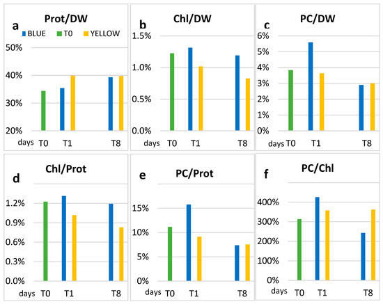 At T8, the PC/DW and PC/Prot ratios are similar in yellow and blue light, as expected by literature [51]. Also, in the PC/Chl ratio, the highest value at T1 is in blue light (Figure 7f). Our results are not unique, since an increase in phycocyanin in Spirulina exposed to blue light was observed also by Chen et al. [41], who did not comment on this result.