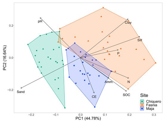Statistics calculations were performed using the IBM SPSS Statistics V21.0 software package. The significance level for all tests was set to p = 0.05. To check for differences in the soil characteristics among the study sites, a one-way ANOVA and LSD or T2 Tamhane post-hoc test were performed for normally distributed (Kolgomorov-Smirnov test) and homocedastic (Levene test) variables. Otherwise, non-parametric (i.e., Kruskal- and Tukey-type) tests were used instead. Principal component analysis (PCA) was performed using the ‘stats’ package, R version 4.1.2, using the soil parameters’ standard scores [56], and plotted using the ‘autoplot’ function from the R ggfortify 0.4.14 package [57]. PCA of the soil physicochemical properties was conducted on 72 samples and was based on the calculated component loading values for EC, pH, SOC, N, P, NH4+, clay, silt and sand content.