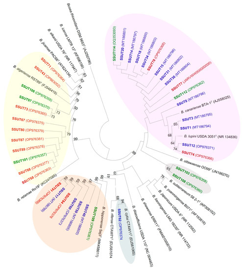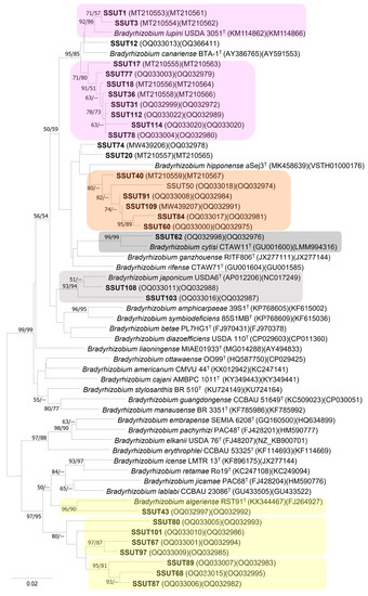 One main group, comprising 16 strains, was grouped within the B. canariense BTA-1T/B. lupini USDA 3051T clade (no BS support). These strains shared over 99.34–100% similarities among them and 99.2–99.93% with these two sister species (with 16S rRNA gene sequences 99.66% similar). Within this big clade, four of the strains were closer to B. lupini (99.78–100% similar) and clustered with this species in a moderately supported subbranch (Figure 2 and Figure S3). The other 12 occupied a subbranch closer to B. canariense (moderately-BS-supported), with which they shared similarities in the range of 99.34–99.93%. It includes strains from the three locations, although most were isolated from Fasnia. A second main group, comprising seven strains, shared sequence similarities of 99.78–100% with B. hipponnense Seq3T and was clustered close to this species on a well-supported branch (Figure 2). The isolation source of the strains in this cluster included representatives from the three locations. Three strains were also included in the B. japonicum superclade but showed different relationships. The B. cytisi branch included only one strain (SSUT62, isolated from Fasnia), sharing 99.93% similarity and forming a highly supported branch. The other two strains isolated from Chiqueros (SSUT103, SSUT108) showed an uncertain phylogenetic affiliation according to the ribosomal phylogeny, sharing 99.2–99.6% similarity with the species B. canariense, B. shewense, B. subterraneum and B. japonicum, but occupied a separate subbranch.