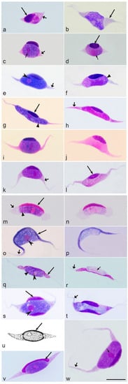 The following developmental stages and the sequence of their occurrence (Figure 1a–p) are found among Leucocytozoon species [1,2,3,4]. Infective stages are sporozoites (Figure 1f,g) and gametocytes (Figure 1j,k,o,p), which develop in vectors and birds, respectively (Figure 1f,g,j,k,o,p). In vectors, both the sexual processes (gametogenesis, fertilization) and the asexual multiplication (sporogony) occur (Figure 1a–e). Sporozoites develop in oocysts (Figure 1e) by means of mitotic (agamous) division. All vector stages (gametes, ookinetes, oocysts, mature sporozoites) occur extracellularly (Figure 1a–f).