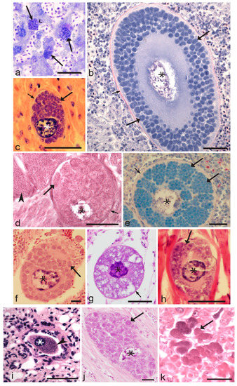 Available information indicates that the formation of meronts (Figure 4a) is an obligatory tissue stage during Leucocytozoon development, but the appearance of megalomeronts (Figure 4b–j) might be skipped in some avian hosts. Megalomeronts might appear after the rupture of incompletely mature meronts, resulting in the development not only of unicellular mature merozoites (Figure 1i), but also of multinuclear cytoplasmic “islands” (syncytia) (Figure 1l), which can be phagocytized by macrophages and probably other reticular cells, in which they continue to grow and produce megalomeronts (Figure 1m). This might happen throughout the body of infected birds (Figure 4b–k), including in the liver, heart, brain, eyes, and sciatic nerves [3,4,61,77,180,246]. However, patterns of megalomeront emergence remain unclear in most Leucocytozoon species. The molecular mechanisms of this phenomenon are unknown.