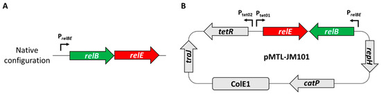 Figure 1. (A) The RelBE type 1 toxin–antitoxin (TA) system from E. callanderi KIST612. (B) The toxicity assay plasmid pMTL-JM101, with the expression of relE driven by an anhydrotetracycline (ATc)-inducible promoter system. Expression of tetR and relE is via Ptet01/02 which are inhibited by TetR until ATc is added. Expression of relB remains under the control of the native promoter of the TA system.
