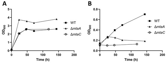 Figure 5. Growth of wild-type E. limosum and deletion mutants ΔmtaA and ΔmtaC on (A) 60 mM glucose and (B) 200 mM methanol. Points represent mean average OD600 readings (n = 3). Error bars represent the standard deviation.