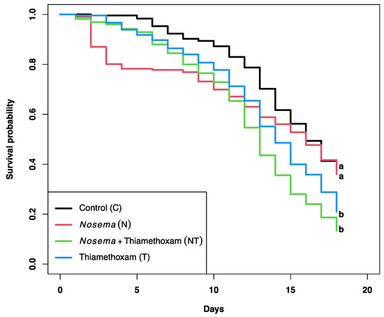 Kaplan–Meier curves showing the survival probability of honey bees exposed to a sublethal dose of thiamethoxam (1 × 10−3 ng/µL of syrup) and/or Nosema ceranae (1 × 105 spores per bee) for 18 consecutive days. Log rank and Holm correction for multiple comparisons were used to determine significant differences between curves, which are indicated by different literals.