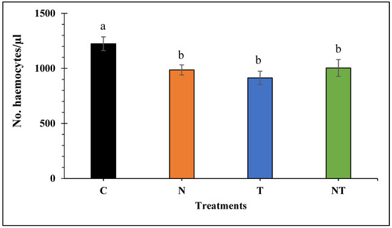 Mean number of haemocytes per µL of haemolymph of honey bees subjected to the treatments for 18 days: Control (C), Nosema ceranae (1 × 105 spores per bee; N), sublethal dose of thiamethoxam (1 × 10−3 ng/µL of syrup; T), and N. ceranae + thiamethoxam (NT). Different literals indicate significant differences between treatments based on one-way ANOVA and Fisher LSD tests of natural log-transformed data. Figure shows untransformed data.