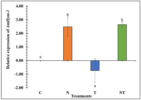 AmHym-1 relative expression in honey bees subjected to the treatments for 18 days: Control (C), Nosema ceranae (1 × 105 spores per bee; N), sublethal dose of thiamethoxam (1 × 10−3 ng/µL of syrup; T), N. ceranae + thiamethoxam (NT). AmHym-1 expression was calculated using the Livak 2−ΔΔCt method, with β-actin as reference gene and 0 ng as calibrator. Different literals indicate significant differences between treatments based on one-way ANOVA and Fisher LSD tests. Log2 transformed data are presented.