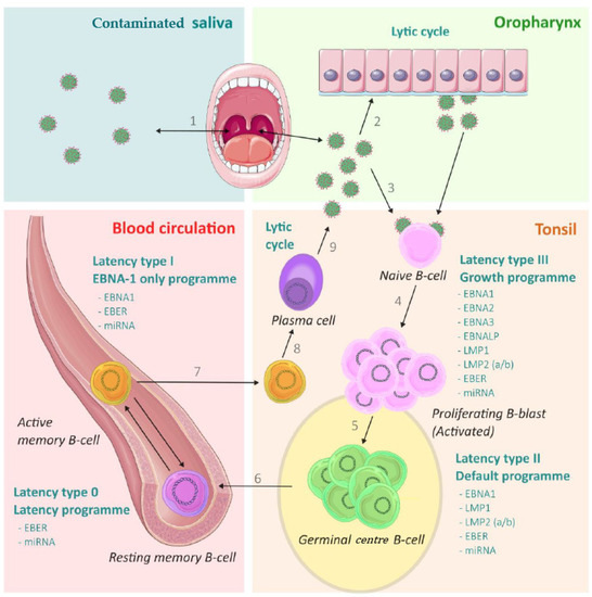 During primary infection after contact with contaminated saliva, the virus can either replicate first in the epithelial cells of the oropharynx or directly infect naive and/or memory B-cells in the lymphoid tissue of the tonsils. These infected naive B-cells will express a set of viral latency genes that will induce B-cells proliferation and prevent their apoptosis. The latent cycle of EBV, which does not produce any virions or lytic cycle proteins, is divided into several steps chronologically described as follows: Type III latency or “growth programme”, during which most of the latent genes are expressed, such as EBNA1, EBNA2, EBNA3A/B/C, EBNA-LP, LMP1 and LMP2, as well as many miRNAs. This type III latency allows clonal expansion of infected B-cells [22,23]. Some of these activated B-cells will move in the germinal centre of the tonsils, where type II latency or “default programme” will take place. During this programme, only EBNA1, LMP1 and LMP2, as well as some miRNAs, are produced, transforming infected B-cells in memory B-cells. It is suggested that Hodgkin’s disease originates from these germinal centre B-cells in latency II [21]. Infected memory B-cells will persist lifelong in the germinal centre and serve as a reservoir for EBV. They may reach other secondary lymphoid sites and remain there via the bloodstream. The type I latency or EBNA-1-only programme takes place in the bloodstream. In this programme, only EBNA1 and some miRNAs are produced, allowing these memory B-cells to divide and thus replicate the EBV genome [24]. The germinal centre model predicted that Burkitt’s lymphoma arises from these latency I memory B-cells [21]. Latency 0 also takes place in the bloodstream, where memory B-cells, which do not produce any viral protein, allow EBV to evade the immune system, especially the CD8+ T-cell response [3,25,26,27].