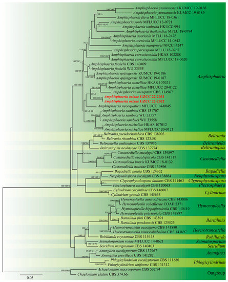 - Samarakoon, M.C.; Maharachchikumbura, S.S.; Liu, J.K.; Hyde, K.D.; Promputtha, I.; Stadler, M. Molecular phylogeny and morphology of Amphisphaeria (=Lepteutypa) (Amphisphaeriaceae). J. Fungi 2020, 6, 174. [Google Scholar] [CrossRef] [PubMed]