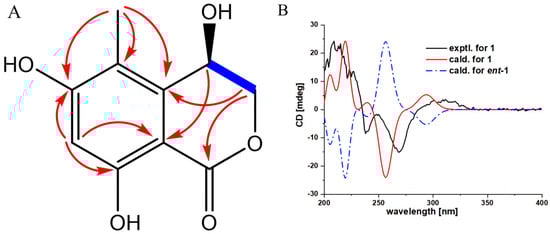 Compound 1 was isolated as a white powder, and its molecular formula was determined as C10H10O5 by high-resolution mass spectrometry (HRESIMS) (m/z 209.0465[M-H]+, calcd. for C10H9O5, 209.0455), indicating 6 degrees of unsaturation. UV spectra indicated the presence of a benzophenone moiety in the compound because of the maximum absorption at 267 and 314 nm. The IR spectrum indicated the existence of groups such as hydroxyl (3366 cm−1), carbonyl (1669 cm−1), benzene ring (1621, 1499 cm−1), and methyl (1468 cm−1). The 1H-NMR spectral data (Table 2) showed the presence of a single aromatic proton signal δH 6.35 (1H, s), a hydroxylated methine signal δH 4.89 (1H, dd, J = 2.4, 2.4 Hz), two oxygenated methylene signals (δH 4.59 (1H, dd, J = 12.6, 2.4 Hz) and 4.48 (1H, dd, J = 12.6, 2.4 Hz)), and a methyl signal δH 2.16 (3H, s). The 13C-NMR spectral data (Table 2) give a total of 10 carbon signals, consisting of one ester carbonyl, six aromatic carbons corresponding to a benzene ring, one oxygenated methylene carbon, one hydroxylated sp3 methine, and a methyl. These data were quite similar to those of the known analog (R)-4-acetyl-6,8-dihydroxy-5-methylisochroman-1-one (4), with the main difference being that signals for the sp3 methine C-10 and the attached acetyl substituent in 4 were replaced by signals for one hydroxylated sp3 methine at δc/H 62.1/4.89 in 1, which indicates that a hydroxyl rather than an acetyl substituent as in 4 is located at C-10 of 1. This deduction was further confirmed by COSY correlations of H-10/H2-9 and HMBC correlations (Figure 3A) from H-10 to C-4; H2-9 to C-5 and C-7; H3-11 to C-1, C-5, and C-6; and H-2 to C-1, C-3, and C-4. To ascertain the absolute configuration of 1, The conformations of the isomers of compound 1 were generated using the iMTD-GC method embedded in the Crest program [31]. ECD calculations for 1 (10S) and ent-1 (10R) were performed using Gaussian software, the results of which were compared with experimental values (detailed ECD calculations are in the Supplementary Materials). As shown in Figure 3B, the experiment ECD curve matched well with the calculated curve for 1, thus assigning its absolute configuration as 10S.