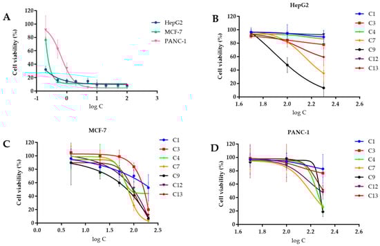 Effect of compounds on the cell viability of different tumor cells. (A) Effect of Adriamycin on the cell viability of three tumor cells; (B) effect of compounds on the cell viability of HePG2 tumor cells; (C) effect of compounds on the cell viability of MCF–7 tumor cells; (D) effect of compounds on the cell viability of PANC–1 tumor cells.