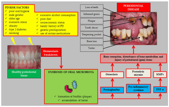 Personal, social, systemic, and local risk factors associated with oral dysbiosis lead to periodontal disease development and progression through activating pathogenic pathways [19].