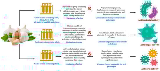 Different mechanisms of action through which garlic extract’s compounds assert antibacterial, antifungal, and antiviral effects [78].