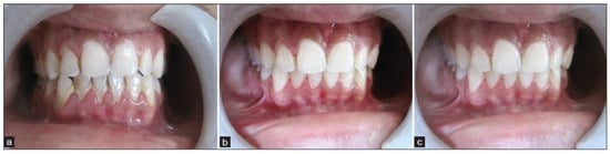 Results of a study on beneficial anti-inflammatory effects of Aloe vera + scaling treatment [(a) baseline; (b) one-month post-op; and (c) three-month post-op] to reduce plaque-induced gingivitis [103].