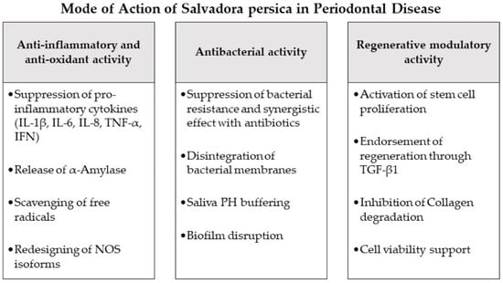 - Mekhemar, M.; Geib, M.; Kumar, M.; Radha; Hassan, Y.; Dörfer, C. Salvadora persica: Nature’s Gift for Periodontal Health. Antioxidants 2021, 10, 712. [Google Scholar] [CrossRef] [PubMed]